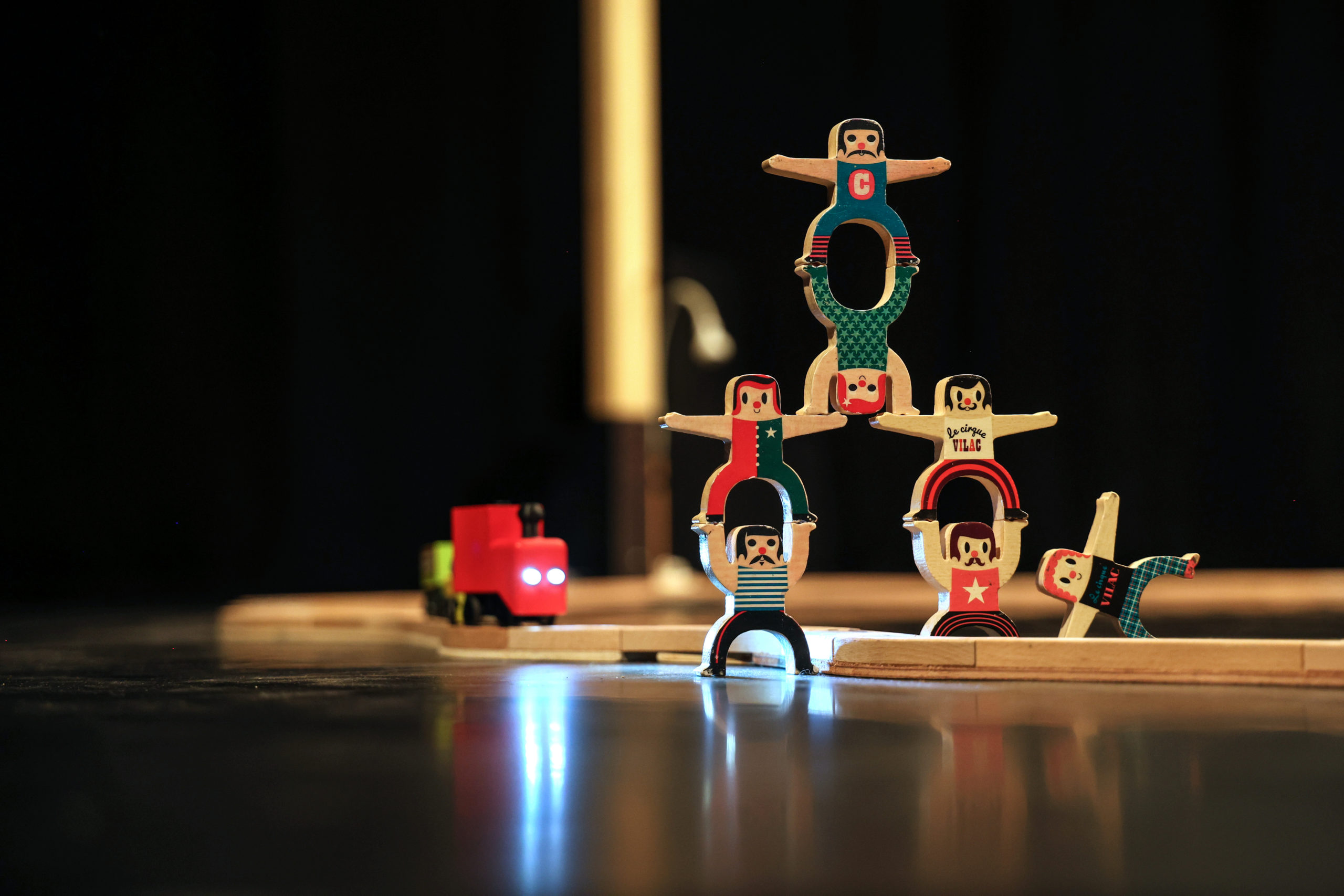Ainsi, dans un espace circulaire, deux comédiennes-manipulatrices inventent des univers à base de jouets dans une chorégraphie de corps et de sons. Il s’agit ici de croiser le geste de l’interprète qui manipule à celui de l’enfant qui joue.